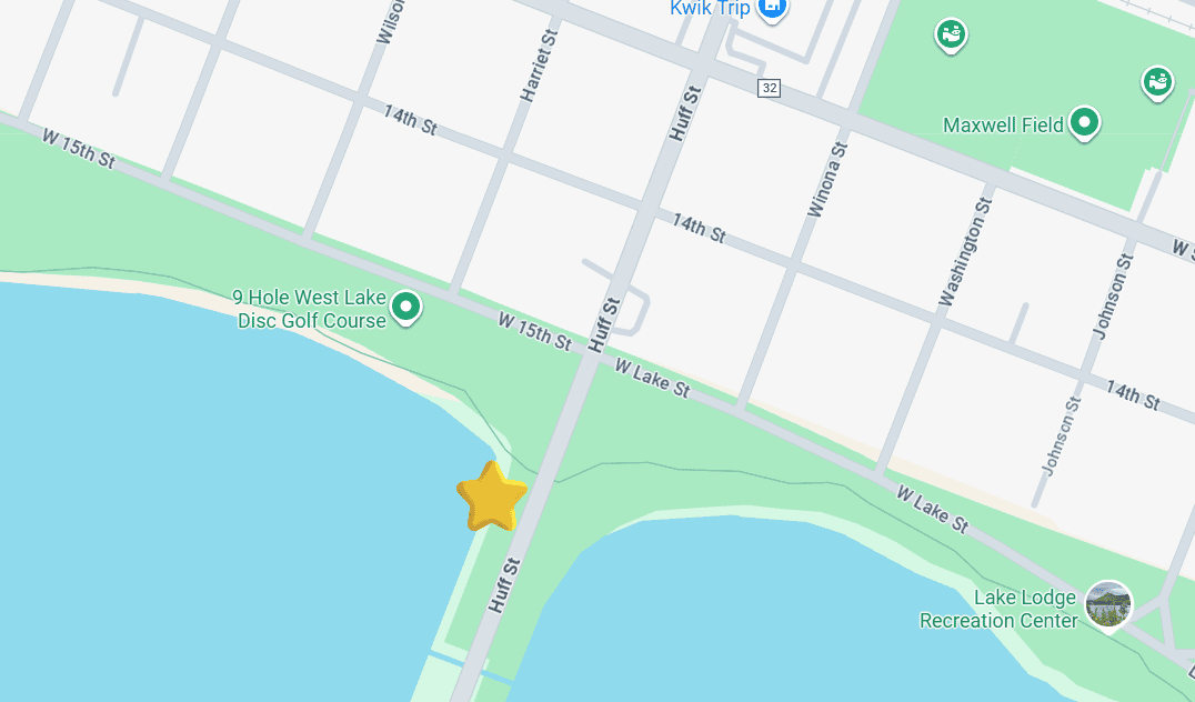 Photos will be just off Huff Street on the SMALL lake near the disc golf field. The gold star marks the location. Parking would be best on W 15th Street as there is a sidewalk you can walk on to the location. You can also park on the opposite side of Huff Street and cross at the crosswalk as well.