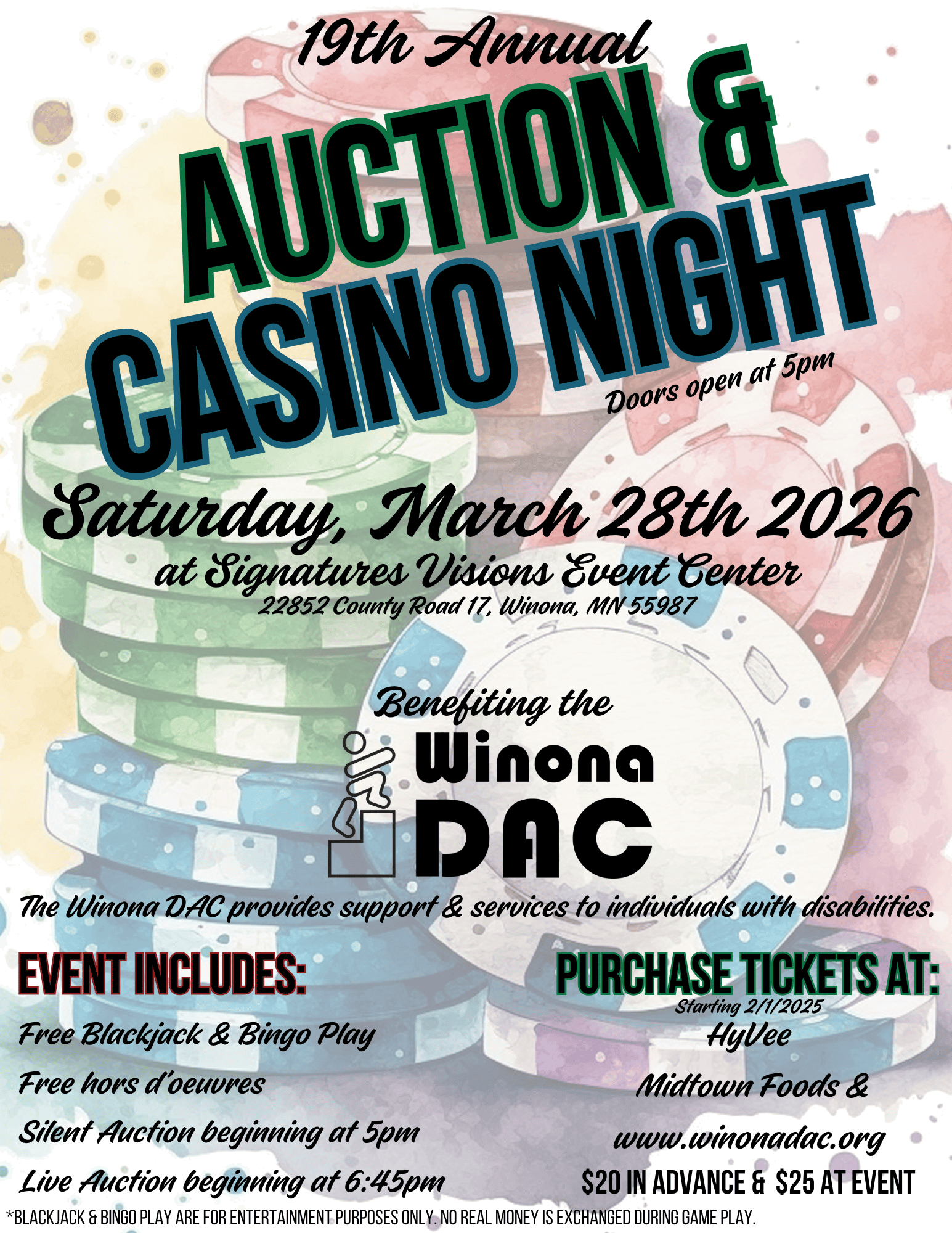 Each year we host an Auction and Casino Night, and we are proud to announce that we are back at it getting ready for this year’s auction. All of the funds raised from this event are used to support the DAC and the individuals we serve. The event is hosted at Signature’s Vision Event Center in Winona and is open to the public. We encourage you to bring yourself and your friends out for a night of Blackjack*, Bingo*, a silent and live auction, drinks, wine raffle, and appetizers! Doors open at 5:00pm and the silent auction bidding starts immediately following. The live auction will begin at 6:45pm and the silent auction will start closing at the end of the live auction.